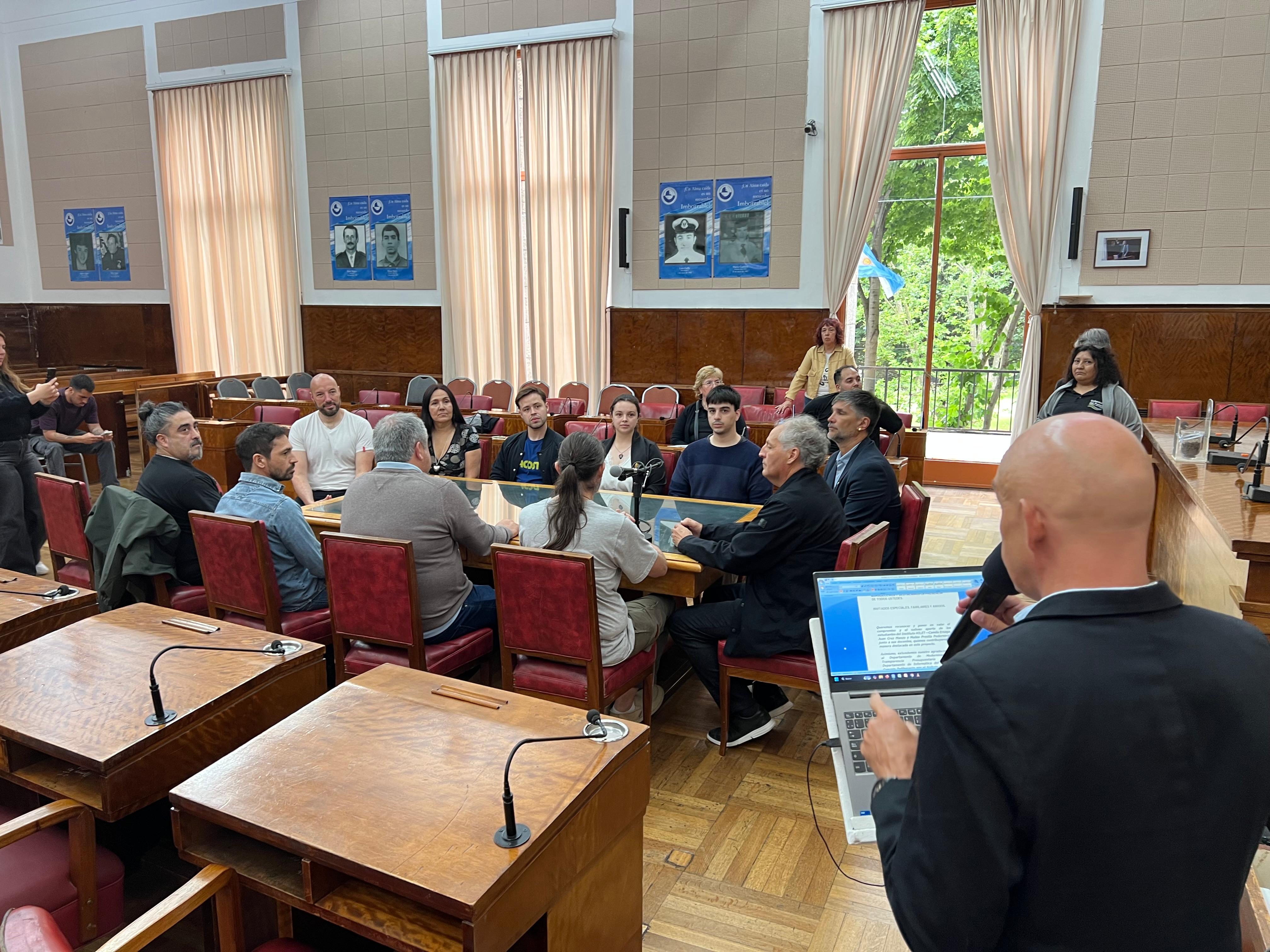 Estuvieron en el recinto el concejal Diego García junto a Marcelo Lacedonia, defensor del Pueblo; Pablo Duthey, Jefe del Departamento del Informática del HCD; Andrés Saravia, titular del Departamento de Modernización y Transparencia Legislativa; y Ramiro Sansinanea, director de la carrera de Analista de Sistemas del Instituto Hilet.