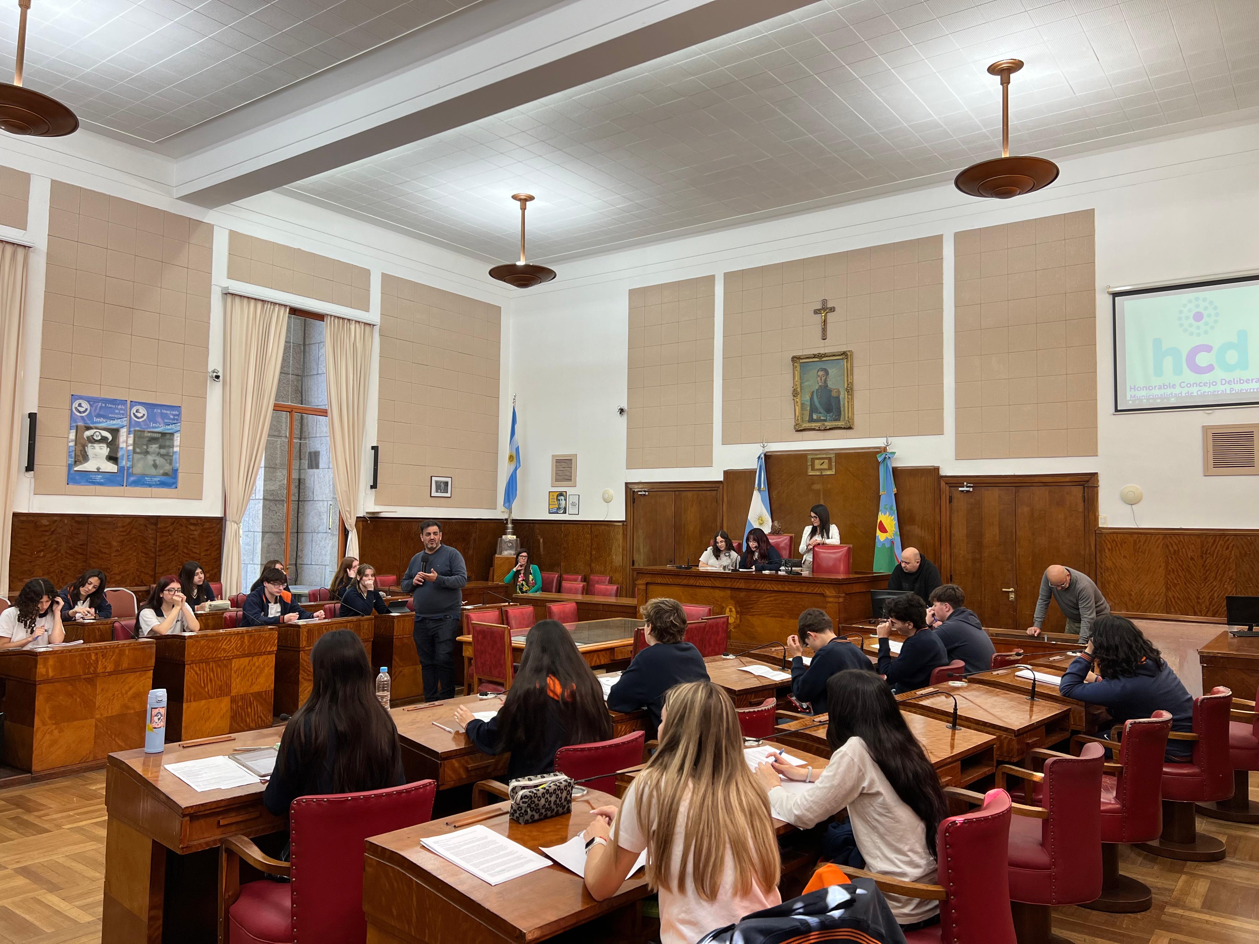 En total, 24 alumnos de 5º año, en el marco de la materia Política y Ciudadanía, asistieron al Concejo junto a la docente Victoria Godoy.