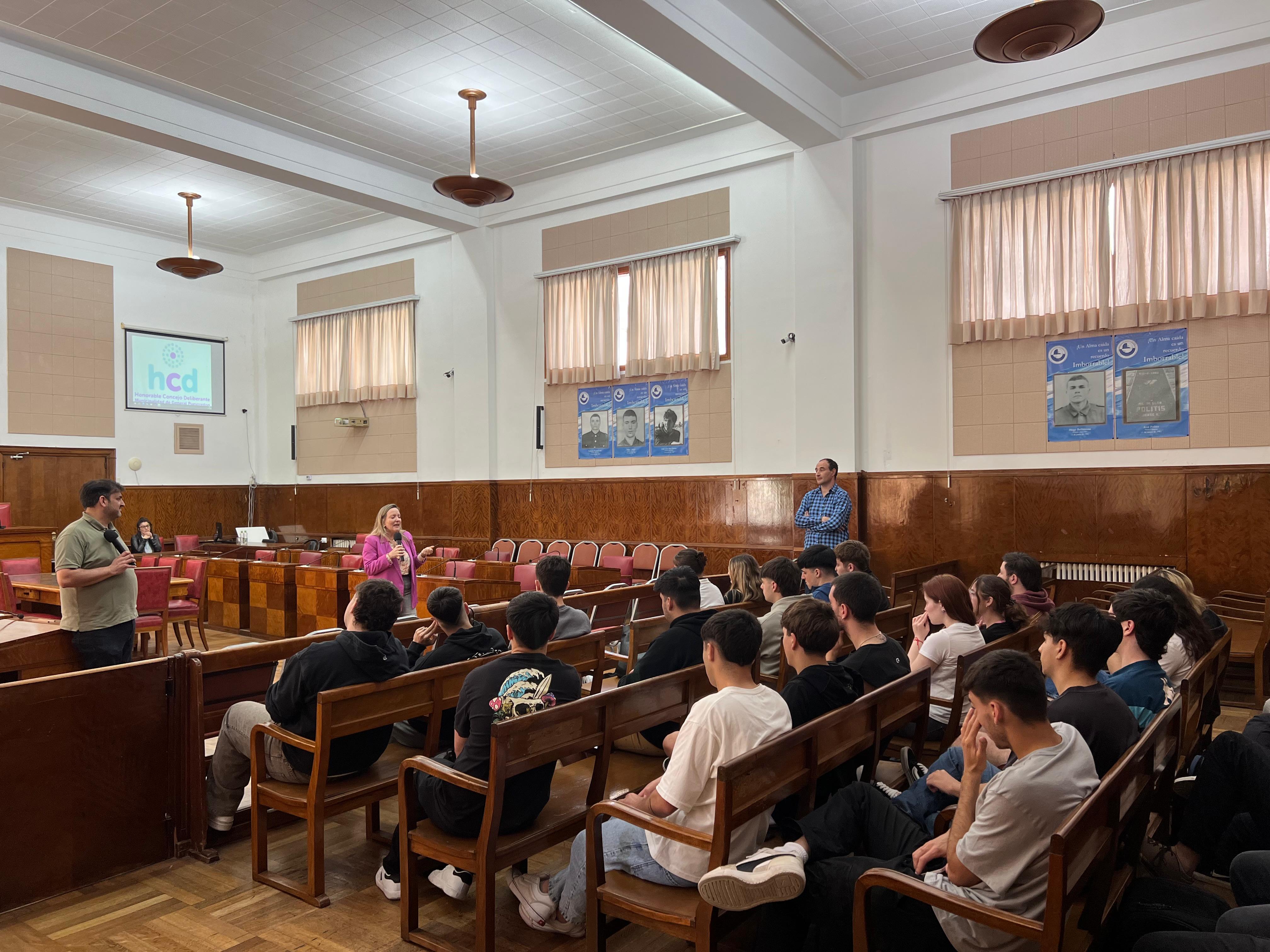 En total, 26 alumnos del 1º año, con el profesor Hernán Kloosterman, estuvieron en el recinto, donde fueron recibidos por el director de Actas, Referencia Legislativa y Digesto, Sebastián Méndez, y por la concejal Cecilia Martínez.